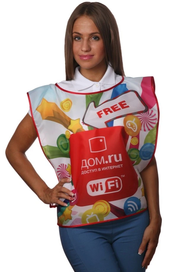 Накидка с полной запечаткой надевается поверх основной одежды, а по своей форме напоминает жилет. Такие изделия часто можно увидеть на промоутерах, раздающих рекламные листовки, и на интервьюерах, занимающихся проведением соцопросов. Приобретайте у нас накидки с нужными вам изображениями или надписями для своего персонала, контактирующего с людьми от лица вашей фирмы, общественной организации или политической партии.