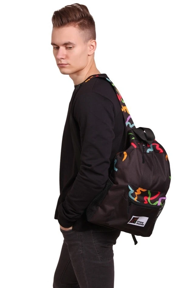 Модель. Рюкзак объемный прямоугольной формы на молнии, без подклада. Удобные широкие лямки регулируются по длине за счет металлических рамок. Лямки выполнены из основной ткани и ременной ленты (стропы) стандартных цветов шириной 3 см. По бокам рюкзака выполнены карманы из сетки, на передней части карман на молнии из основной ткани 18х18 см. Внутреннего деления на отсеки нет.