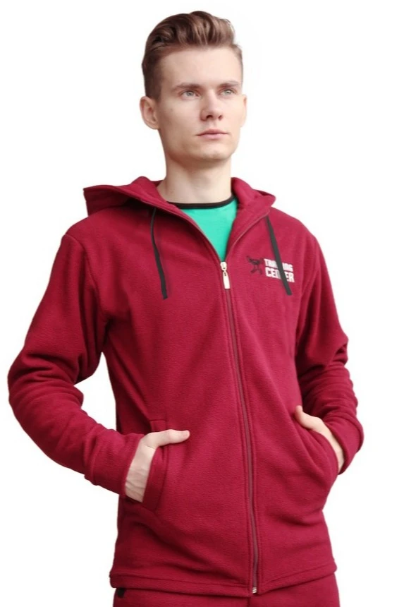 Модель. Прямой силуэт. Толстовка на молнии. Длинные рукава. По низу толстовки продета резинка и установлены фиксаторы. Толстовка с капюшоном. У края капюшона продет плоский шнур шириной 15 мм стандартных цветов. Два прорезных кармана в листочку без молнии. Возможно бесплатное комбинирование деталей разных цветов (например, рукава могут отличаться по цвету от остальных деталей). Толстовка выполнена из флиса 300 гр.