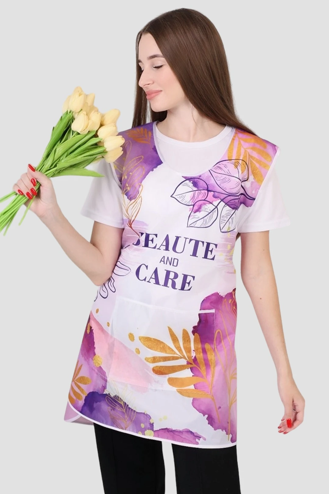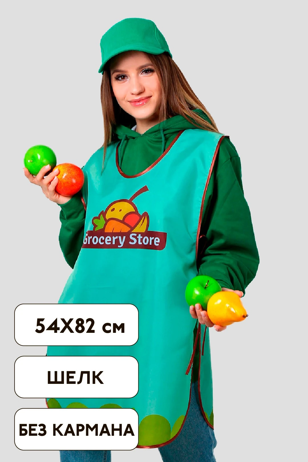 Модель: Накидка фигурной формы без карманов или с одним карманом 20х25 см. Края и горловина фартука обрабатываются косой бейкой стандартных цветов. Завязки длиной 50 см, выполнены из косой бейки.