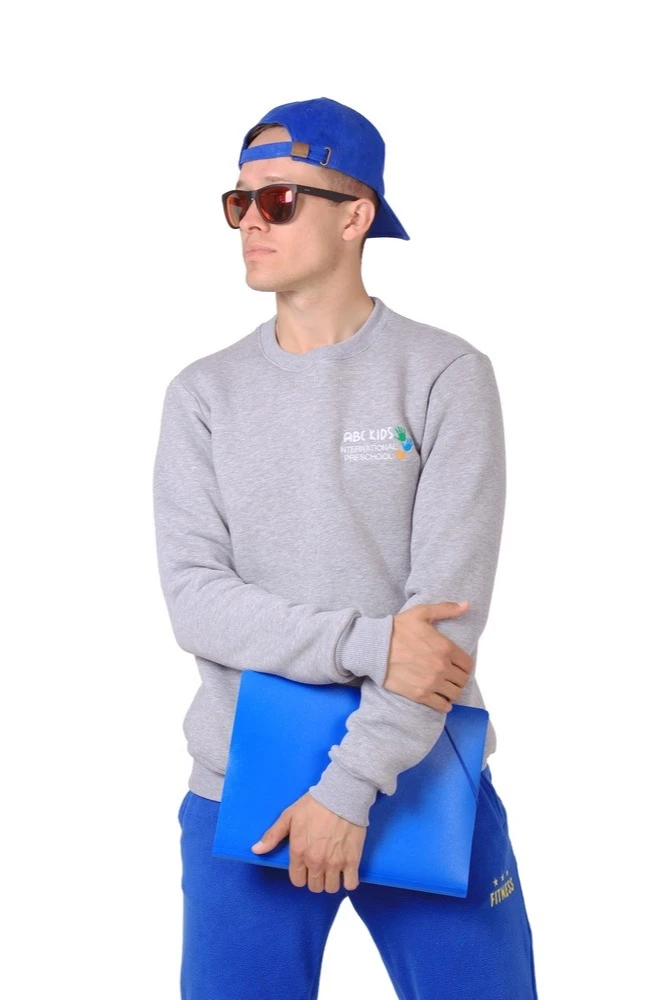 Модель. Прямой силуэт. Толстовка без молнии. Длинные рукава. Низ толстовки и рукавов, а также горловина обработаны тканью кашкорсе (специальная тканная резинка) в цвет толстовки. Толстовка без капюшона и карманов.
