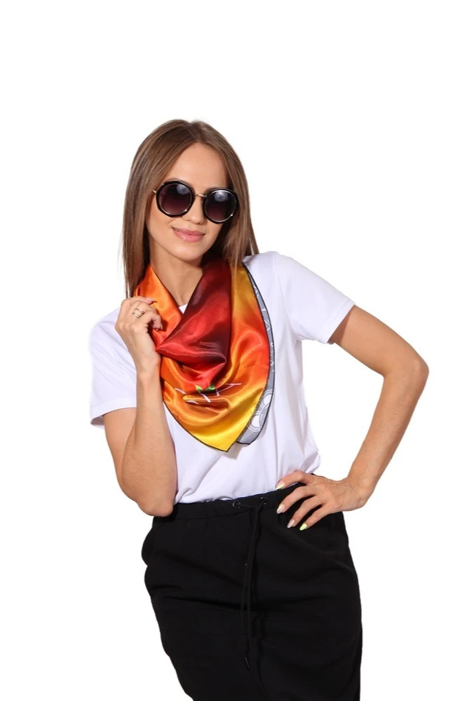 Модель: Платок квадратной формы. Края платка обработаны ролевым швом.