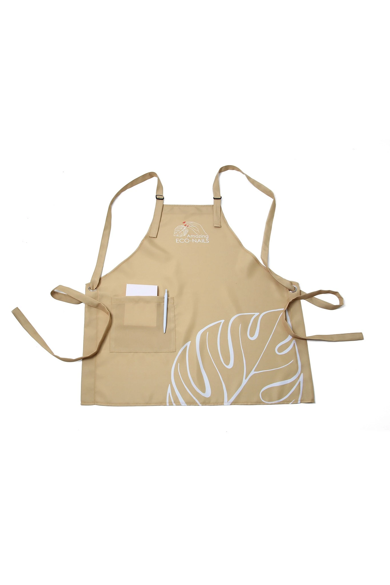Модель: Фартук фигурной формы без разреза. Фартук по периметру обработан швом вподгибку. Фартук изготовлен с одним карманом 18х70 см, разделенным на 6 отсеков. Креплением служат перекрещивающиеся на спине лямки. Лямки из основной ткани фиксируются на груди с помощью двух пластиковых регуляторов черного цвета. В районе пояса лямки продеваются через два никелированных люверса диаметром 15 мм.
