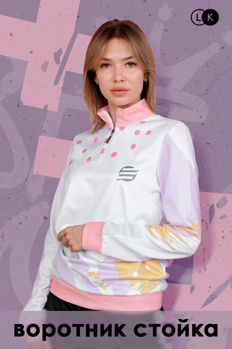 Модель. Толстовка Кейли прямого силуэта. Воротник стойка. Молния до груди толстовки. Длинные рукава с манжетой. Толстовка без капюшона. Без карманов. Низ толстовки, манжеты рукавов и горловина выполнены из сублимационной ткани прима.