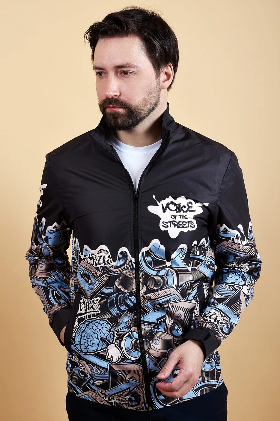 Модель. Ветровка Дилан прямого силуэта с длинным рукавом с манжетами на липе. Ветровка на молнии, без капюшона и без подклада. Два прорезных кармана в листочку без молнии. Низ изделия прошит в подгибку, без фиксаторов.