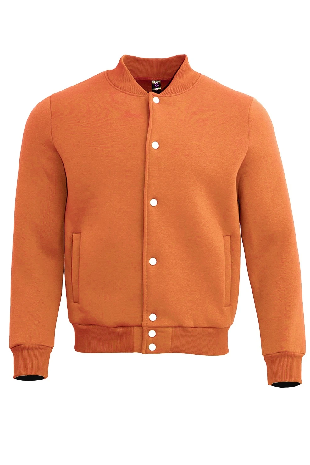Модель. Бомбер прямого силуэта, без капюшона. Длинные рукава с манжетами из ткани футер с начесом. Низ бомбера и рукавов, а также воротник с закругленными углами выполнены из кашкорсе (специальная тканная резинка) в цвет изделия. Бомбер застегивается на семь кнопок. Имеет два боковых кармана в листочку без молнии.
