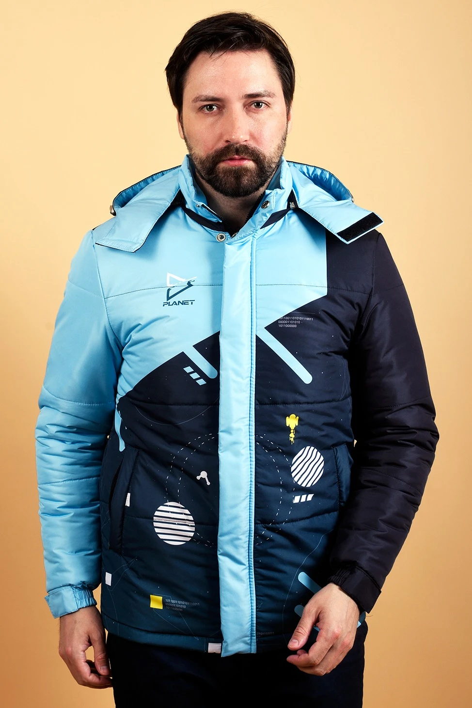 Модель. Куртка Винтер на двойном синтепоне с полной запечаткой и стежкой. Имеет два прорезных кармана в листочку на молнии. Рукава с манжетами на резинке с регулировкой на липе. Подклад рукавов - шелк черного цвета, на полочках и спинке фольгированный подклад. Застежка металлическая молния, закрыта ветрозащитной планкой на кнопках. Куртка с воротником стойкой и съемным капюшоном на молнии. С левой внутренней стороны куртки есть накладной карман. Температурный режим куртки до -20 градусов.