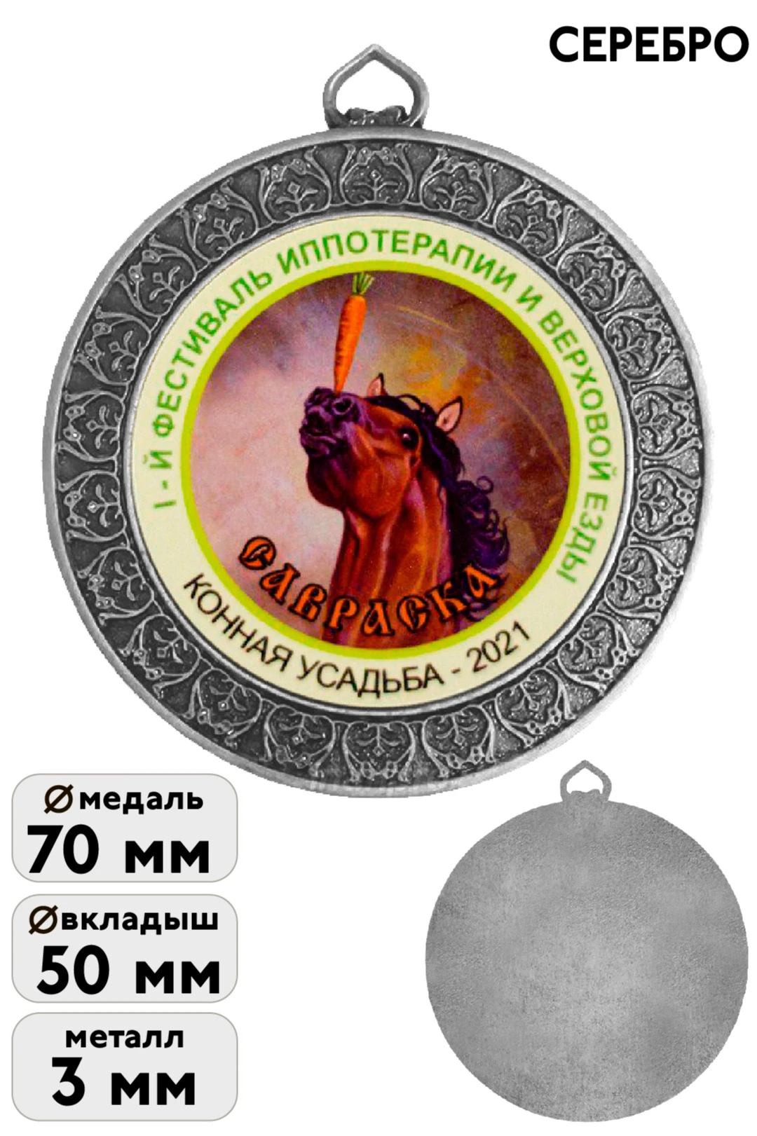 Особенности нанесения: стоимость товара указана с учётом вкладыша, изготовленного по вашему макету (или выбранного из готовых) и установленного на лицевую часть медали, в предусмотренное для него место. Индивидуальный вкладыш представляет собой круглую металлическую пластину с полноцветной печатью вашего макета методом сублимации. Возможно добавление нанесения на оборот медали. Стоимость нанесения на обороте медали не входит в цену и просчитывается отдельно, через менеджера.