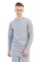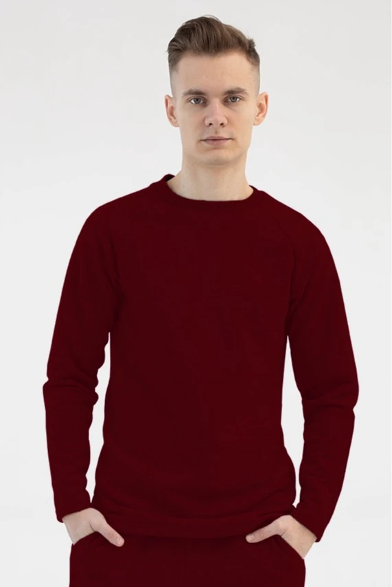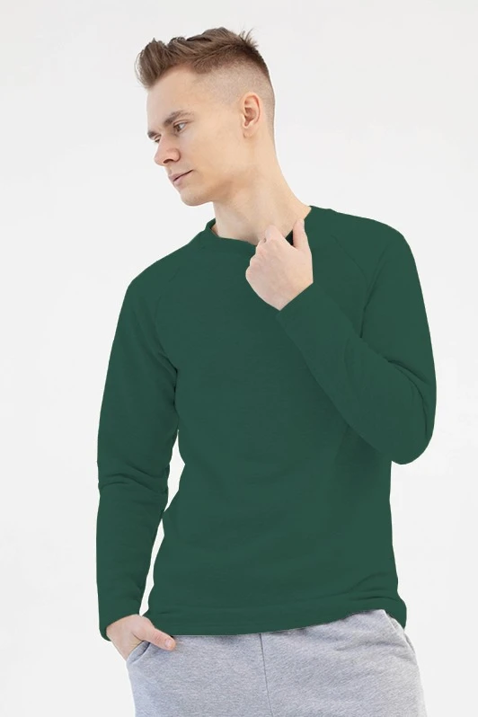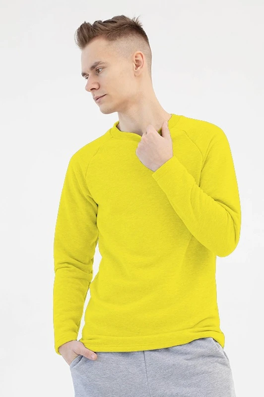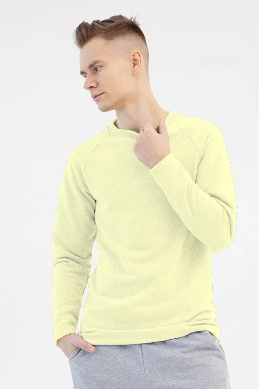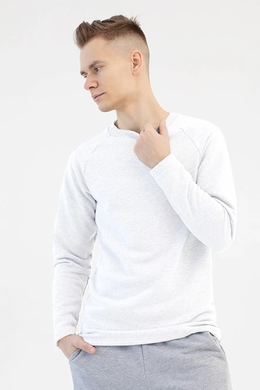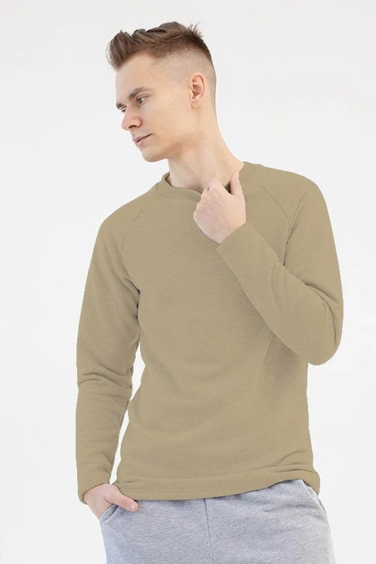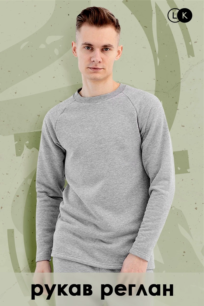 Модель. Лонгслив прямого силуэта, без молнии, рукав реглан длинный. Горловина обработана тканью кашкорсе (специальная тканная резинка) в цвет толстовки. Толстовка без капюшона и карманов.