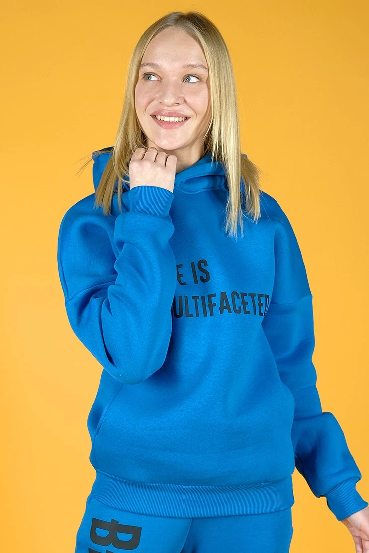 Модель. Худи Кинг прямого силуэта, без молнии. Длинные рукава со спущенной линией плеч. Имеет два кармана в боковом шве. Низ толстовки и рукавов обработаны тканью кашкорсе (специальная тканая резинка) в цвет толстовки. Капюшон пришивной двухслойный.
