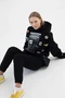 Модель. Худи Фрэнк оверсайз прямого силуэта, без молнии, без карманов. Длинные рукава со спущенной линией плеч. Низ толстовки и рукавов из основной ткани в цвет толстовки. Капюшон пришивной с подкладом из кулирной глади стандартных цветов.