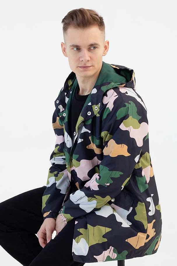 Модель. Ветровка прямого силуэта с длинным рукавом с манжетой на резинке. Пришивной капюшон затягивается резинкой с фиксаторами. Задняя часть удлинённая с фигурным низом. Ветровка застегивается на кнопки (9 шт). Ветровка с подкладом из шелка расцвечивания стандартных цветов. Имеет два кармана с клапаном на кнопках.