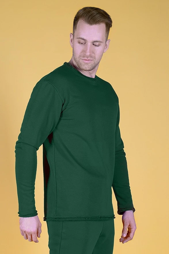 Модель. Толстовка прямого силуэта, без молнии с длинными рукавами и опущенной линией плеч. Низ толстовки и рукавов, а также горловина с имитацией необработанного края. Толстовка без капюшона и карманов.