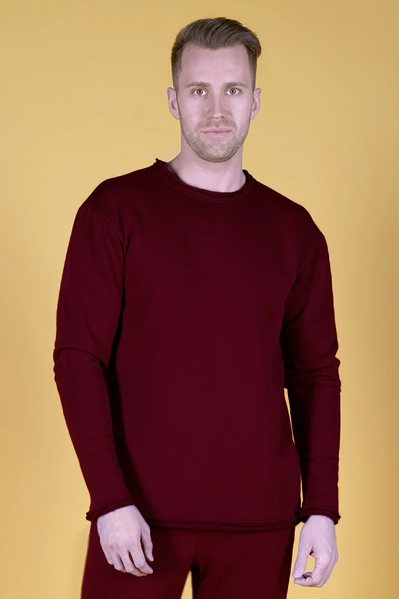 Модель. Толстовка прямого силуэта, без молнии с длинными рукавами и опущенной линией плеч. Низ толстовки и рукавов, а также горловина с имитацией необработанного края. Толстовка без капюшона и карманов.