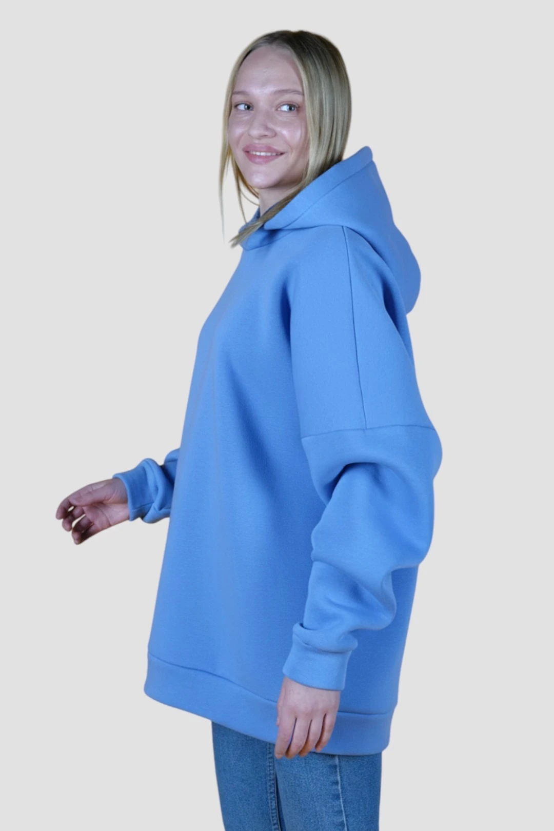 Модель. Худи Фрэнк оверсайз прямого силуэта, без молнии, без карманов. Длинные рукава со спущенной линией плеч. Низ толстовки и рукавов из основной ткани в цвет толстовки. Капюшон пришивной с подкладом из кулирной глади стандартных цветов.