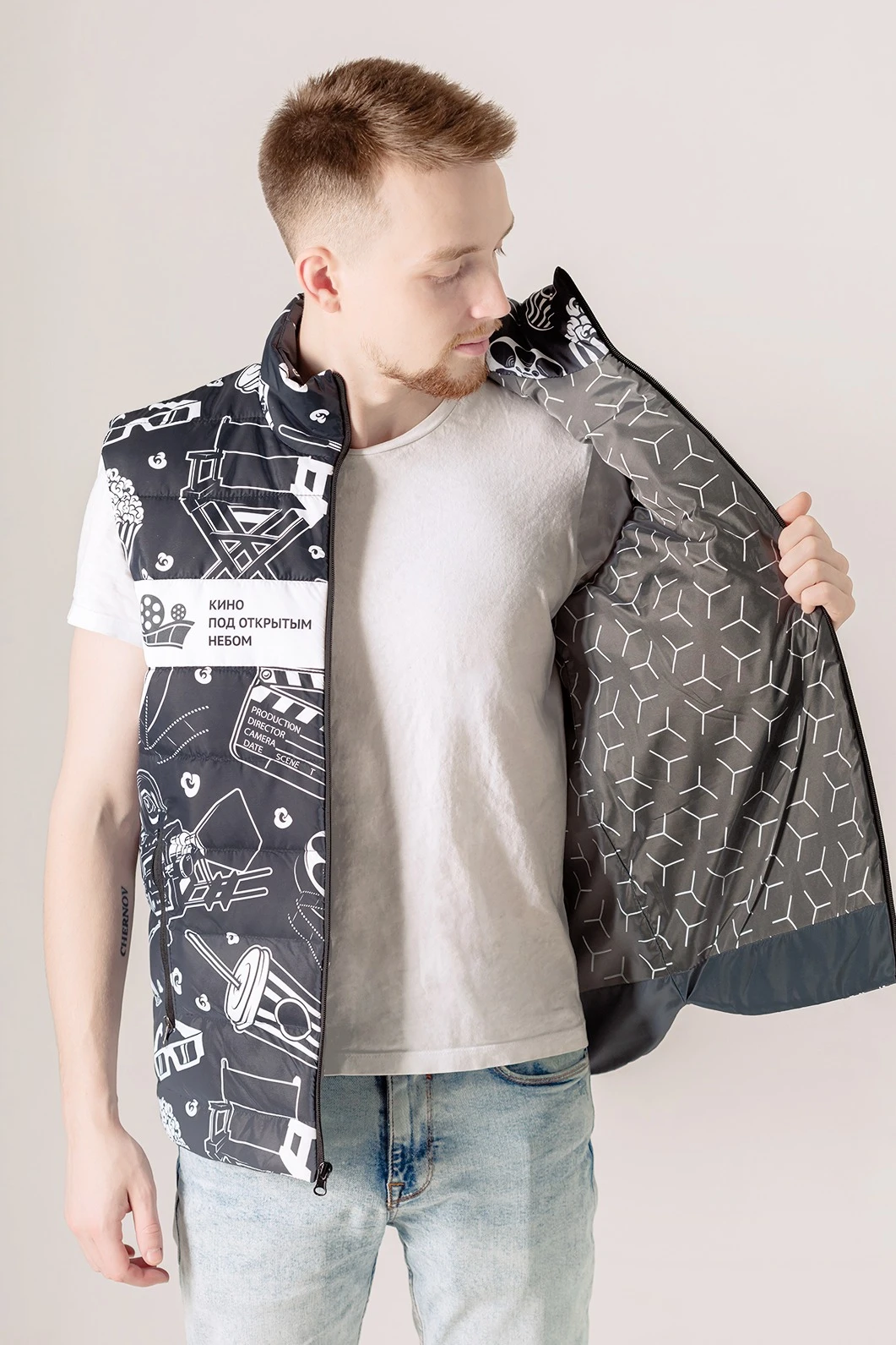 Модель: Жилет Бостон прямого силуэта утепленный синтепоном 200 гр., с подкладом из дешайна с полной запечаткой. Стежка по спинке и полочке, спинка удлиненная. Имеет три кармана в рамку на молнии. Воротник стойка. Застегивается на реверсивную молнию.