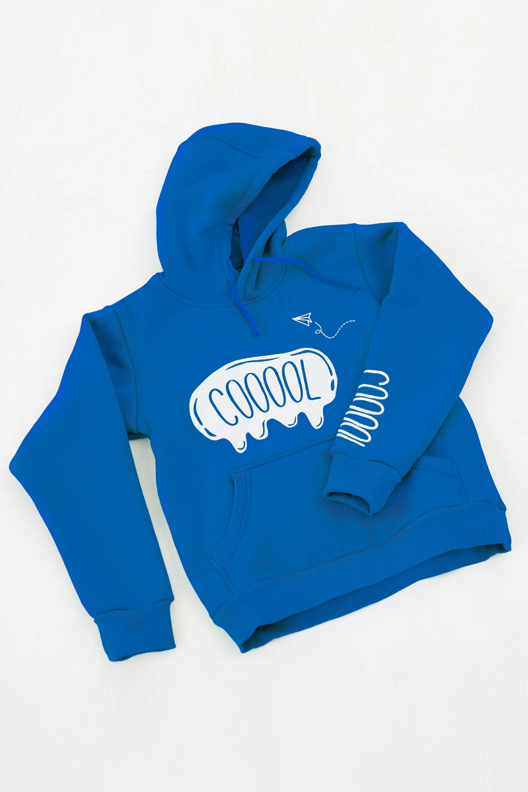 Модель. Толстовка прямого силуэта без молнии. Длинные рукава. Низ толстовки и рукавов обработаны тканью кашкорсе (специальная тканая резинка) в цвет толстовки. Один общий карман по типу кенгуру. Капюшон пришивной двухслойный, внутренний слой из однотонной кулирной глади с лайкрой стандартных цветов на выбор. У края капюшона продет плоский шнур стандартных цветов.