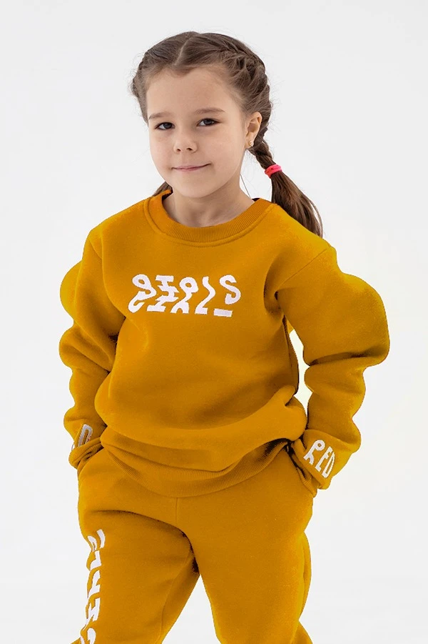 Модель. Толстовка прямого силуэта без молнии, с длинным рукавом. Низ толстовки и рукавов, а также горловина обработаны тканью кашкорсе (специальная тканная резинка) в цвет толстовки. Толстовка без капюшона и карманов.