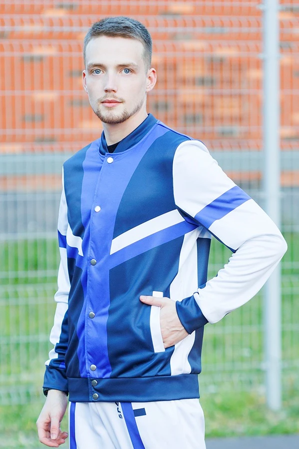 Модель. Прямой силуэт, без капюшона, без подклада. Длинные рукава с манжетами из сублимационной ткани сандвич браш. Низ бомбера и воротник с закругленными углами также выполнены из сублимационной ткани сандвич браш. Вариант застежки бомбера на выбор: на семь металлических кнопок или на молнию. Два боковых кармана в листочку без молнии.