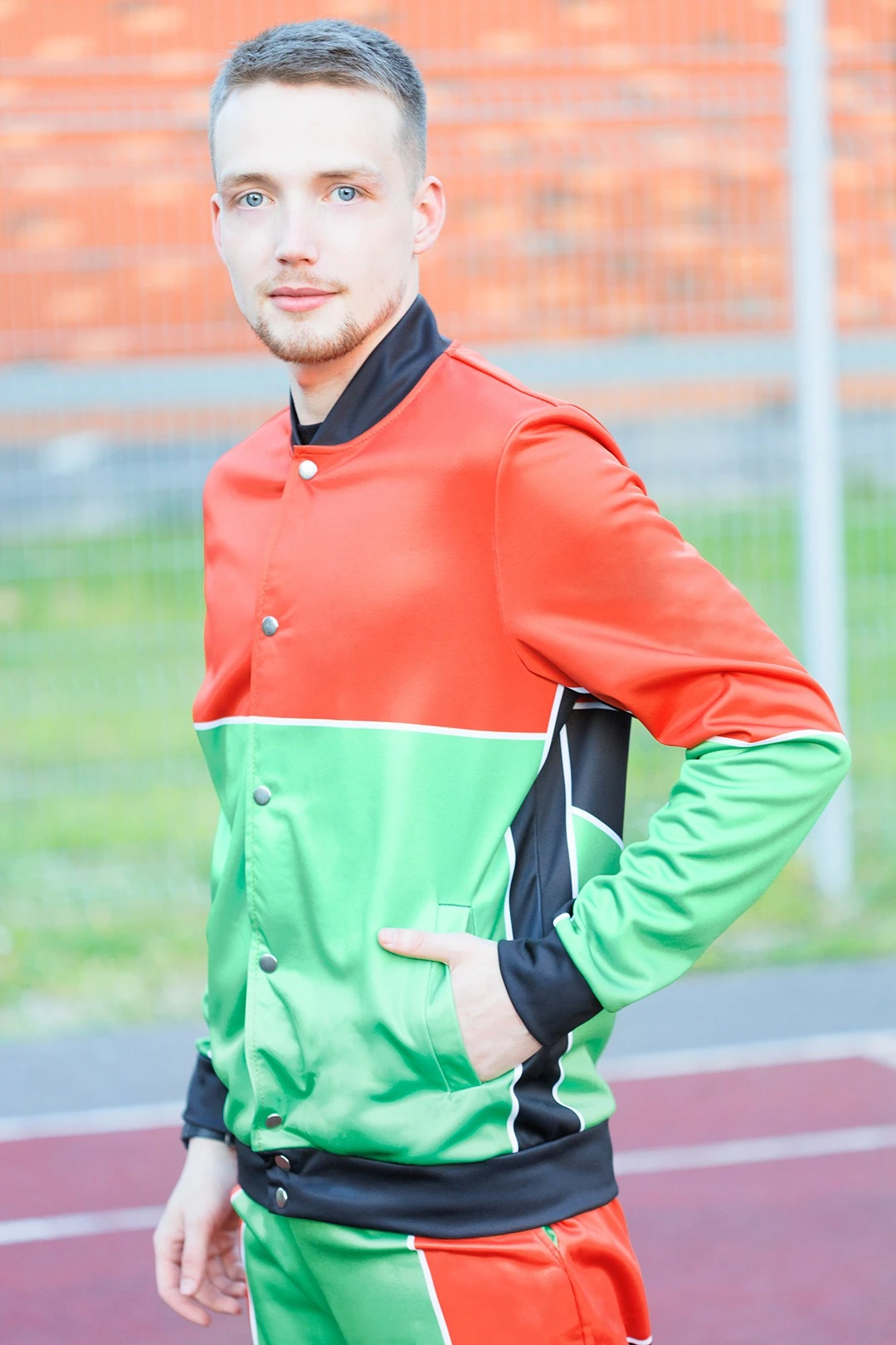 Модель. Прямой силуэт, без капюшона, без подклада. Длинные рукава с манжетами из сублимационной ткани сандвич браш. Низ бомбера и воротник с закругленными углами также выполнены из сублимационной ткани сандвич браш. Вариант застежки бомбера на выбор: на семь металлических кнопок или на молнию. Два боковых кармана в листочку без молнии.