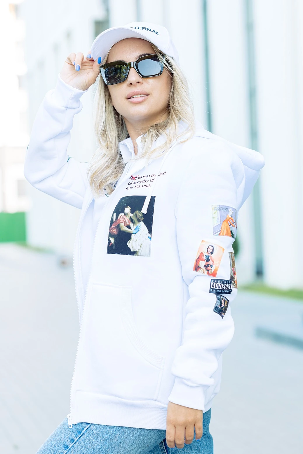 Модель. Прямой силуэт. Балахон на молнии. Длинные рукава. По низу толстовки и рукавов прошита специальная тканная резинка кашкорсе в цвет толстовки. Два раздельных кармана по типу кенгуру. Капюшон пришивной двухслойный, внутренний слой из однотонной кулирной глади с лайкрой стандартных цветов на выбор. У края капюшона продет плоский шнур шириной 15 мм стандартных цветов.