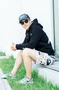 Модель. Прямой силуэт. Толстовка без молнии. Длинные рукава. Низ толстовки и рукавов обработаны тканью кашкорсе (специальная тканая резинка) в цвет толстовки. Один общий карман по типу кенгуру. Капюшон пришивной двухслойный, внутренний слой из однотонной кулирной глади с лайкрой стандартных цветов на выбор. У края капюшона продет плоский шнур шириной 15 мм стандартных цветов.
