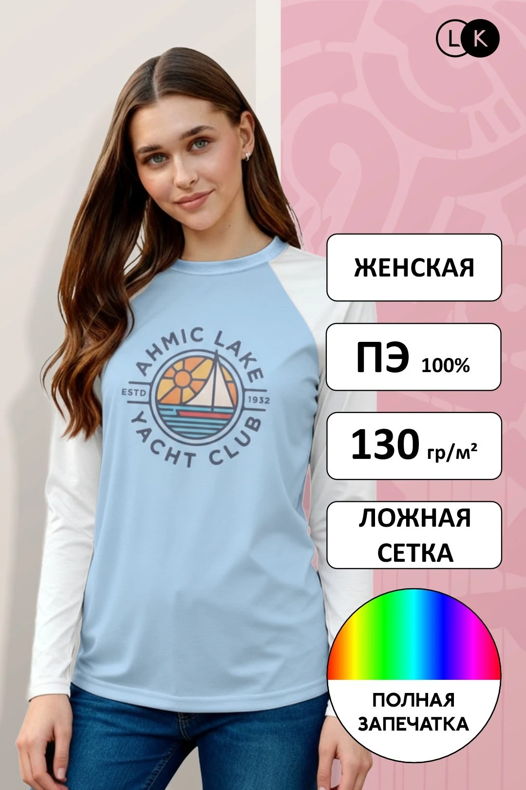 Сублимация. Полноцветная печать осуществляется на всей поверхности лонгслива в процессе производства. Изображение располагается в соответствии с лекалом. Нанесение входит в стоимость лонгслива . Совмещение изображения на швах осуществляется за дополнительную плату.