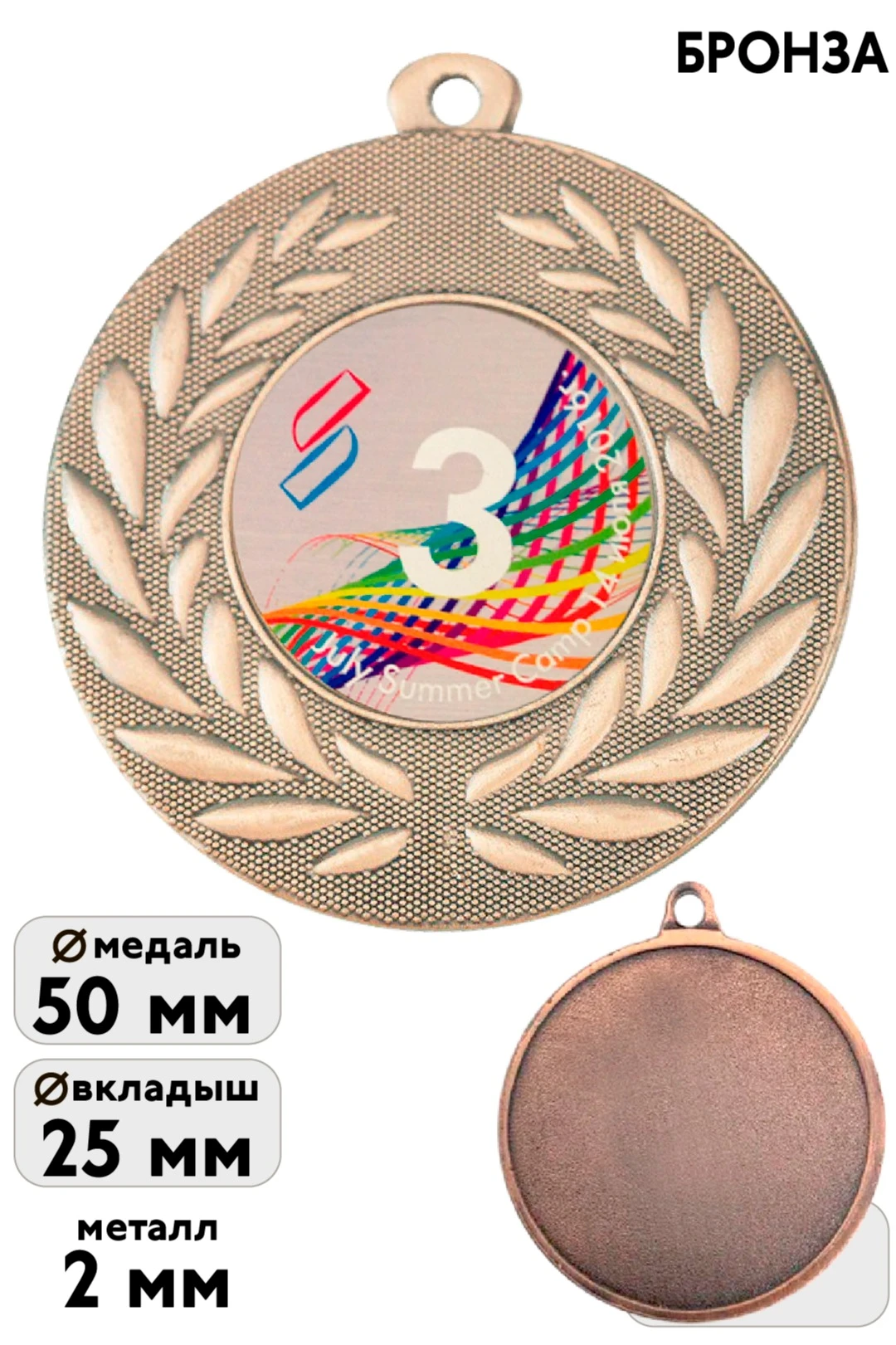 Особенности нанесения: стоимость товара указана с учётом вкладыша, изготовленного по вашему макету (или выбранного из готовых) и установленного на лицевую часть медали, в предусмотренное для него место. Индивидуальный вкладыш представляет собой круглую металлическую пластину с полноцветной печатью вашего макета методом сублимации. Возможно добавление нанесения на оборот медали. Стоимость нанесения на обороте медали не входит в цену и просчитывается отдельно, через менеджера.
