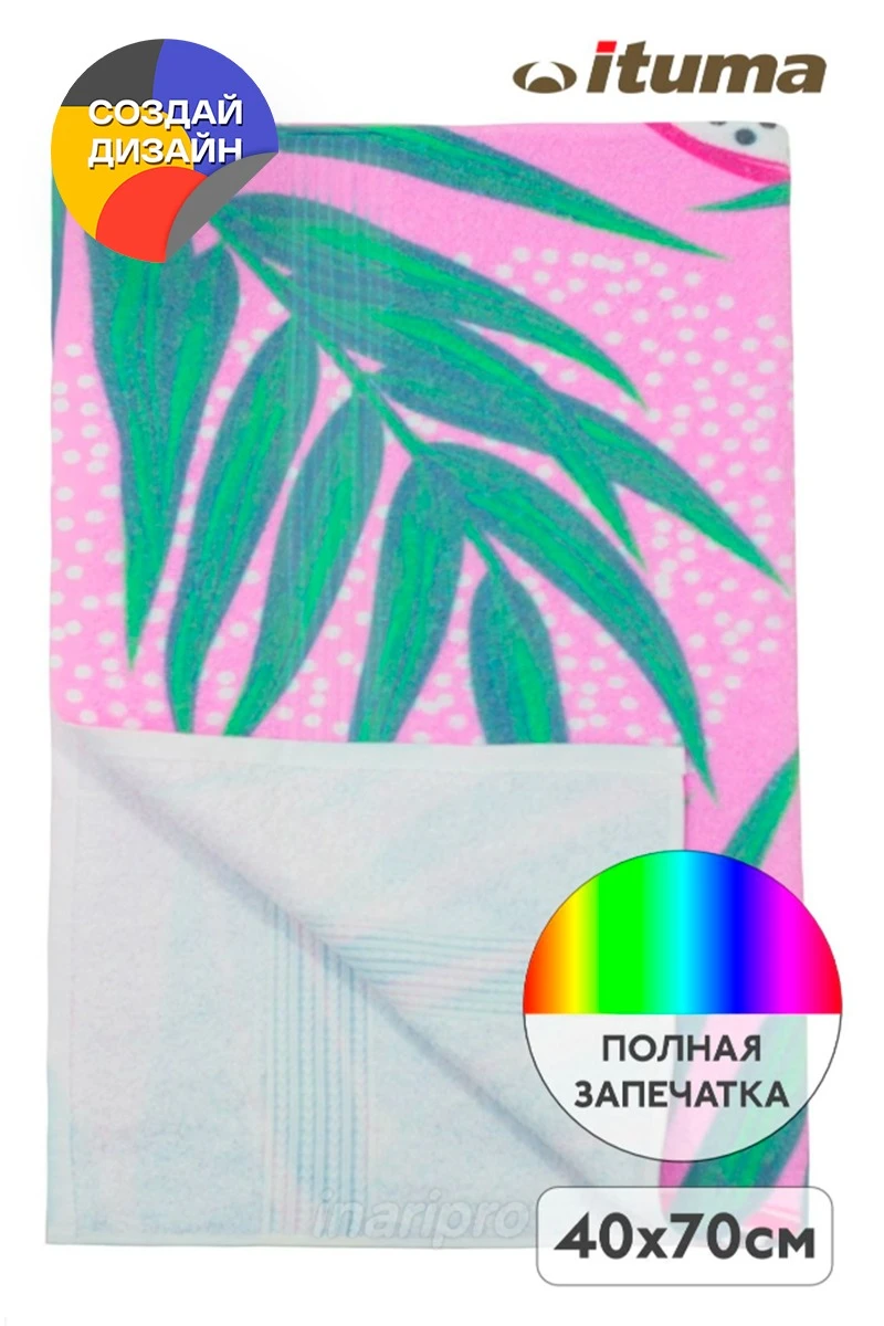 Особенности нанесения: Полноцветное нанесение осуществляется методом сублимации на поверхность полотенца. Изображение размещается в соответствии с лекалом. Печать с одной или с двух сторон. В силу технологических особенностей печать на хлопке ложится с сильным искажением цвета. Цвета становятся бледными. Применяйте в макете пастельные цвета.
