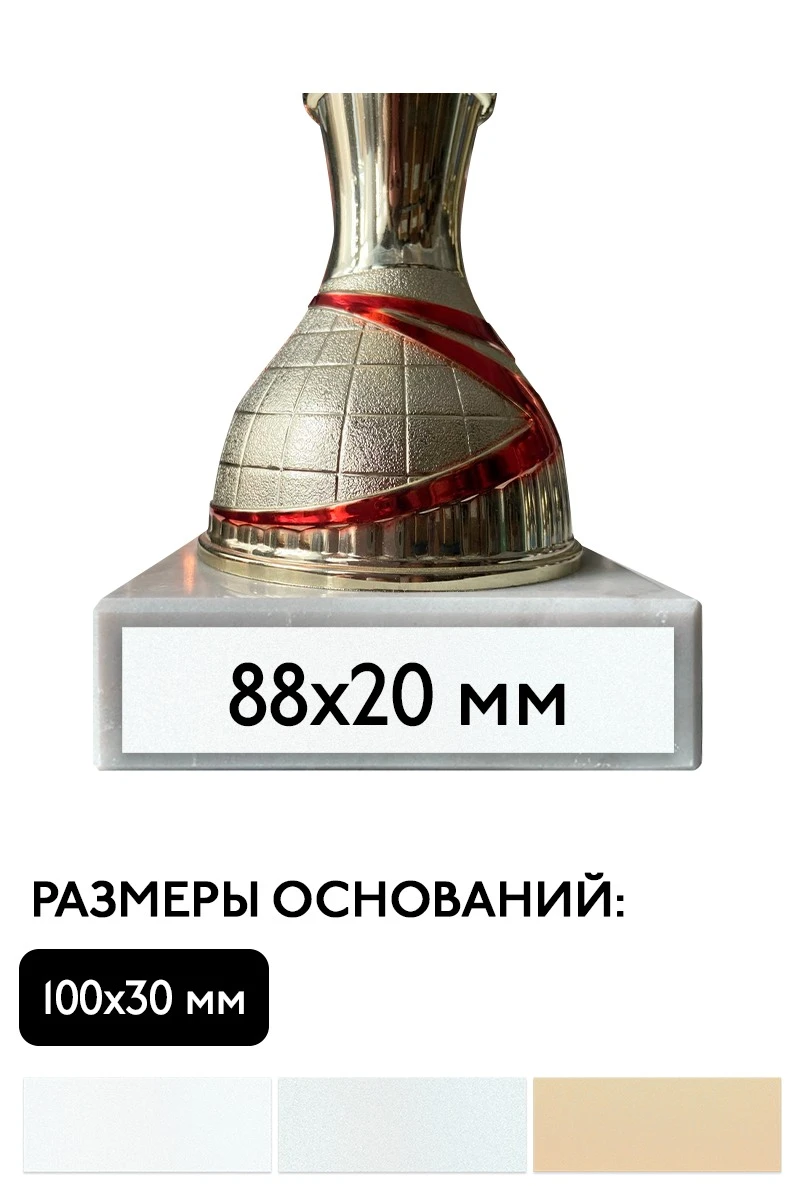 Шильд - информационная табличка, на которой размещены надписи и обозначения. Она закрепляется к основанию наградного кубка или статуэтки. Шильд прямоугольной формы с креплением на двусторонний скотч. Двусторонний скотч входит в стоимость товара. Размер шильда зависит от размера основания и является стандартным.