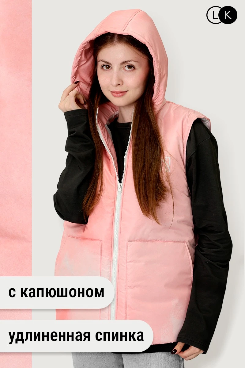 Модель: Жилет Трис прямого силуэта. Имеет два накладных кармана на утеплителе. Центральная застежка молния. Капюшон втачной. Низ изделия фигурный - удлинённая спинка.