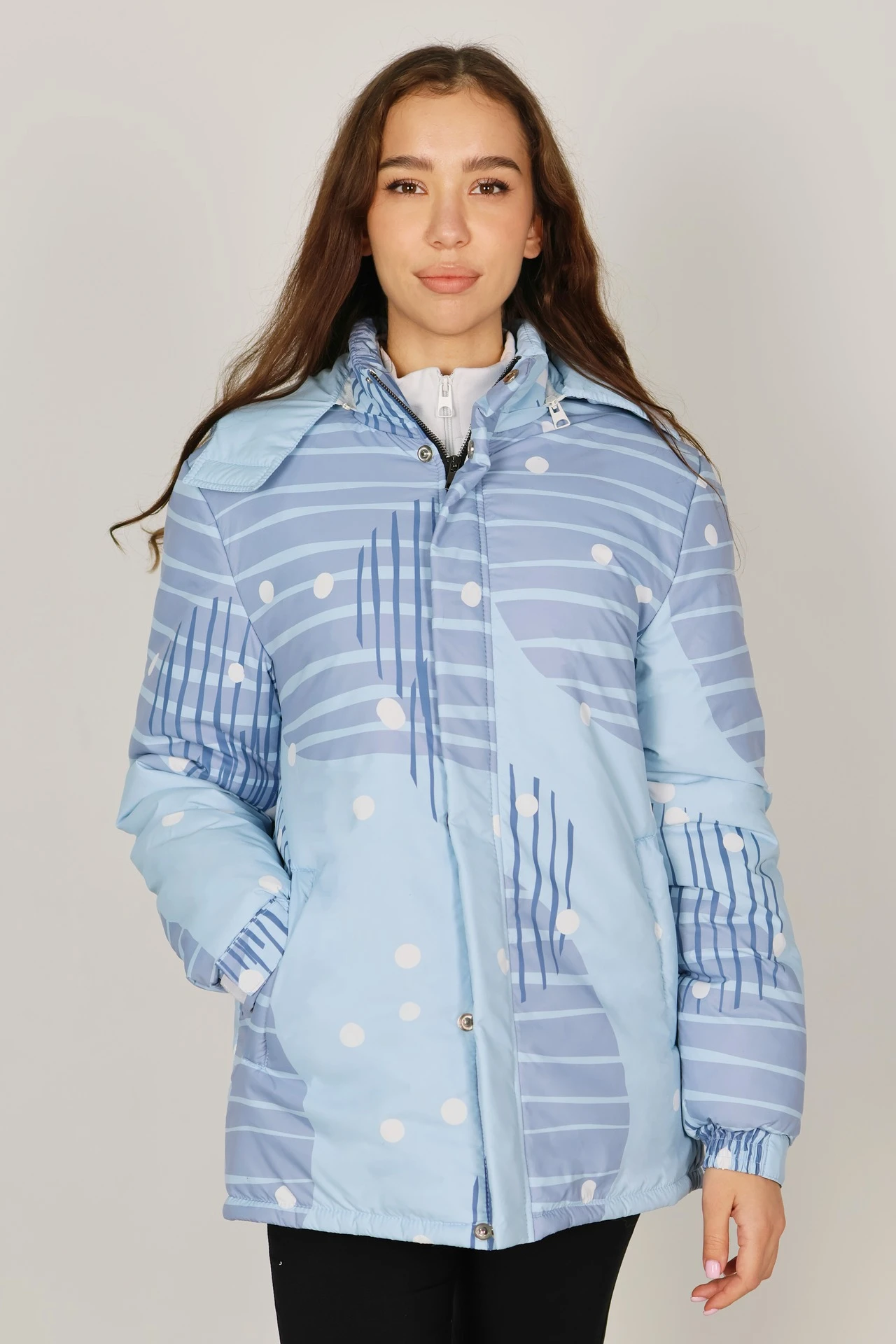 Модель. Куртка Винтер на двойном синтепоне с полной запечаткой и стежкой. Имеет два прорезных кармана в листочку на молнии. Рукава с манжетами на резинке с регулировкой на липе. Подклад рукавов - шелк черного цвета, на полочках и спинке фольгированный подклад. Застежка металлическая молния, закрыта ветрозащитной планкой на кнопках. Куртка с воротником стойкой и съемным капюшоном на молнии. С левой внутренней стороны куртки есть накладной карман. Температурный режим куртки до -20 градусов.
