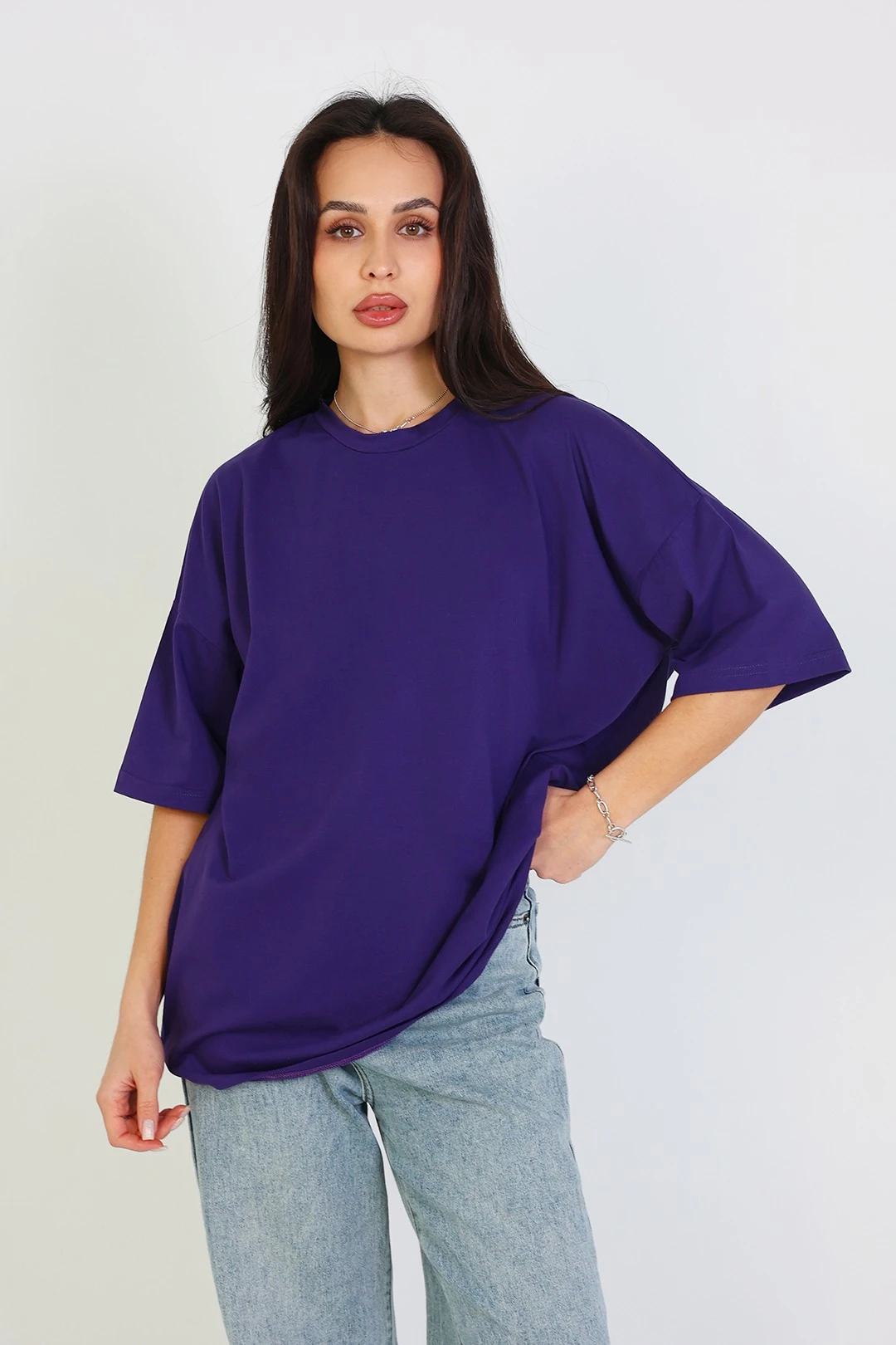 Модель. Футболка оверсайз. Обработка горловины - рибана из основной ткани. Низ изделия и рукава подгибаются внутрь. Форма ворота О-образная.