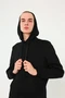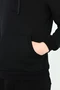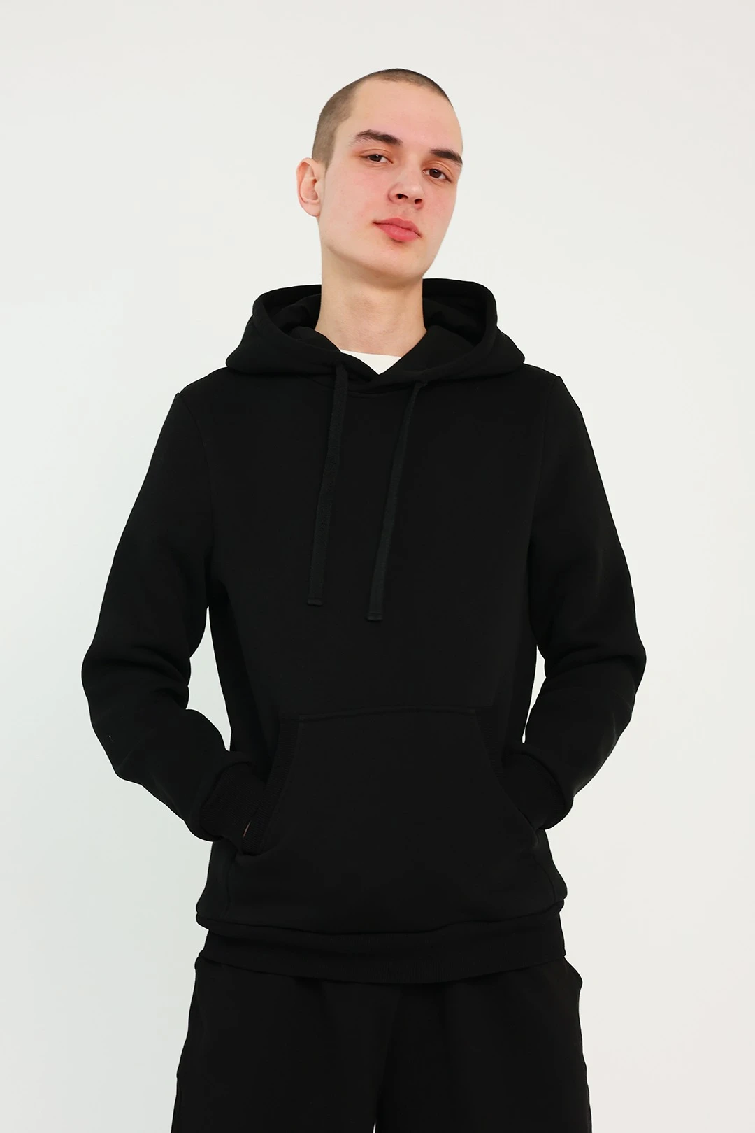 Модель. Прямой силуэт. Толстовка без молнии. Длинные рукава. Низ толстовки и рукавов обработаны тканью кашкорсе (специальная тканая резинка) в цвет толстовки. Один общий карман по типу кенгуру. Капюшон пришивной двухслойный, внутренний слой из однотонной кулирной глади с лайкрой стандартных цветов на выбор. У края капюшона продет плоский шнур шириной 15 мм стандартных цветов.