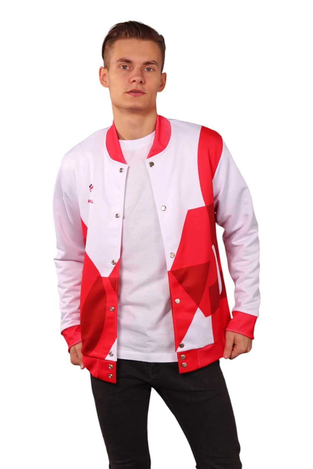 Модель. Прямой силуэт, без капюшона, без подклада. Длинные рукава с манжетами из сублимационной ткани сандвич браш. Низ бомбера и воротник с закругленными углами также выполнены из сублимационной ткани сандвич браш. Вариант застежки бомбера на выбор: на семь металлических кнопок или на молнию. Два боковых кармана в листочку без молнии.