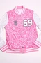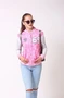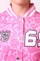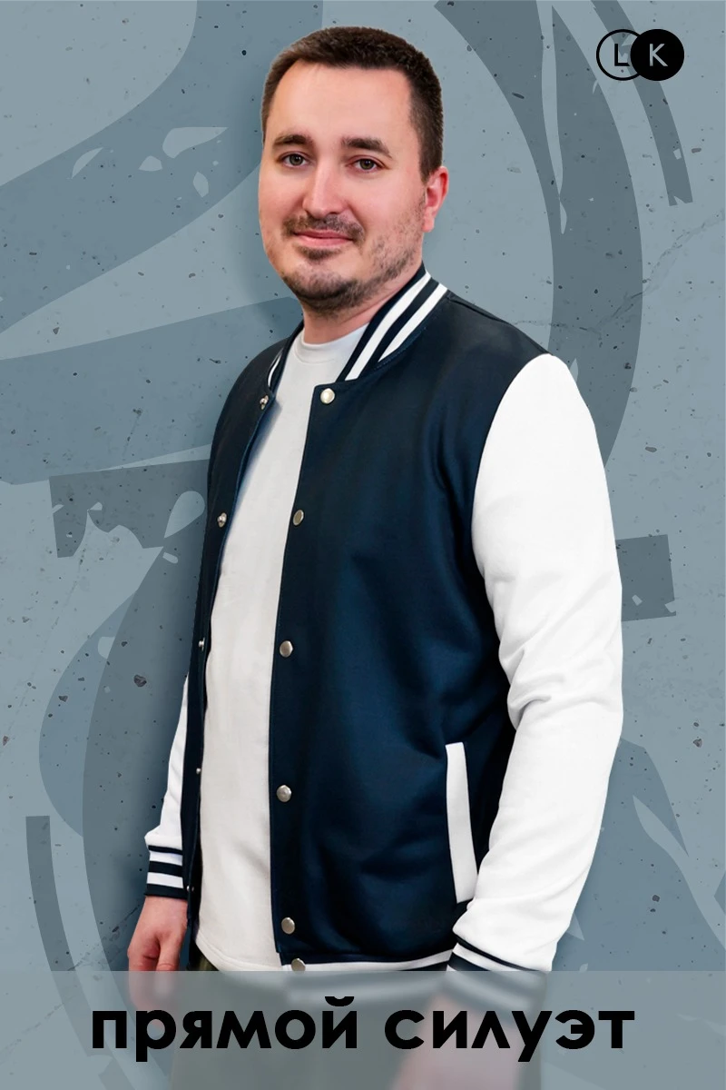Модель. Прямой силуэт, без капюшона. Длинные рукава с манжетами из сублимационной ткани прима. Низ бомбера и воротник с закругленными углами также выполнены из сублимационной ткани прима. Вариант застежки бомбера на выбор: на семь металлических кнопок или на молнию. Два боковых кармана в листочку без молнии.