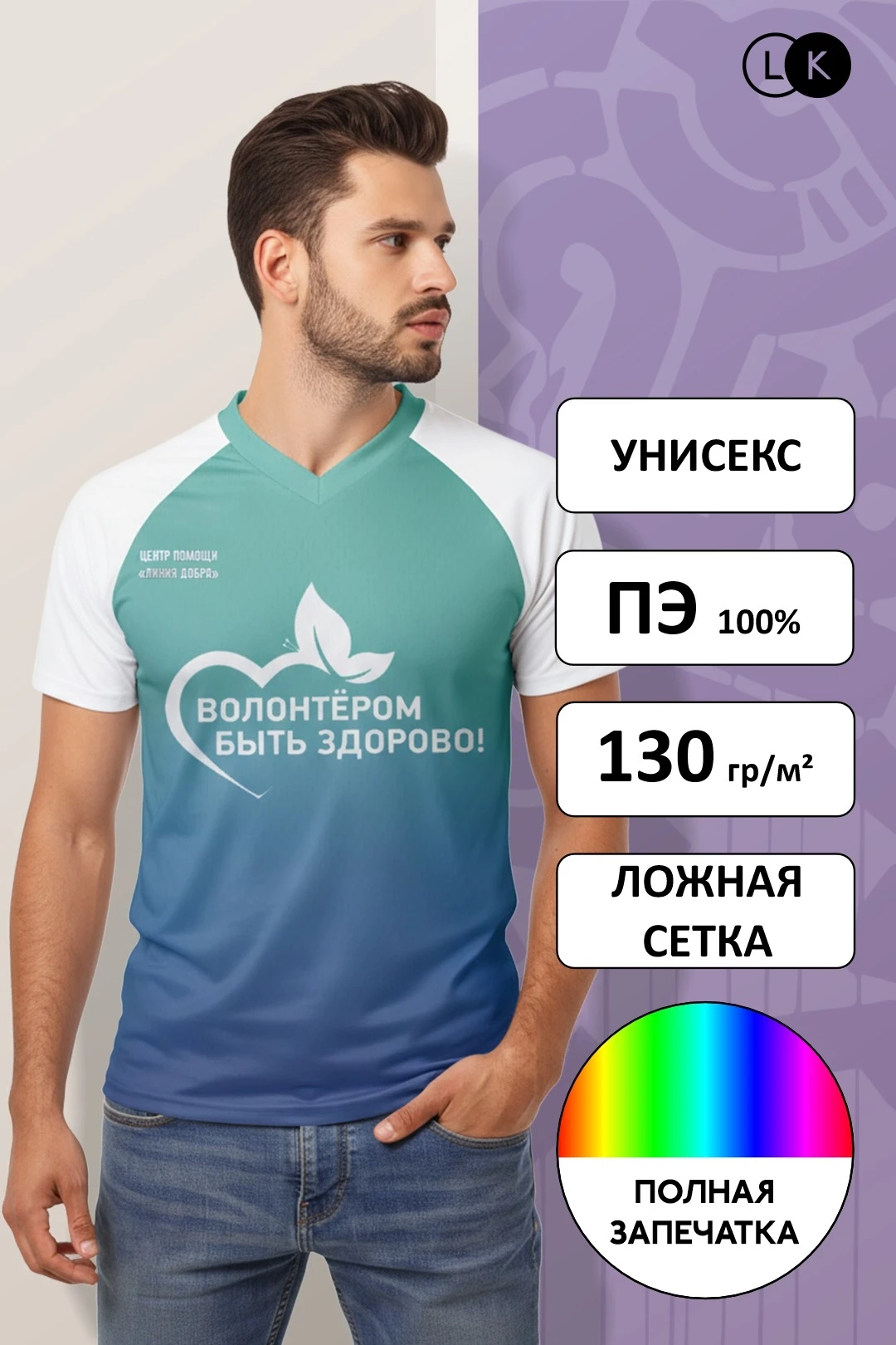 Сублимация. Полноцветная печать осуществляется на всей поверхности футболки в процессе производства. Изображение располагается в соответствии с лекалом. Нанесение входит в стоимость футболки.
