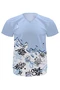 Модель. Прямой силуэт. Рукав короткий, реглан. Футболка имеет боковые швы без разрезов по низу изделия. Оформление горловины руликом (кантом) из основной ткани или рибаной. Форма ворота V-образная.