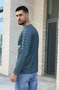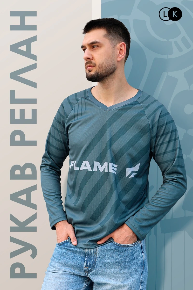 Модель. Прямой силуэт. Рукав длинный, реглан. Лонгслив имеет боковые швы без разрезов по низу изделия. Оформление горловины руликом (кантом) из основной ткани или рибаной. Форма ворота V-образная.