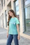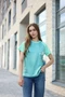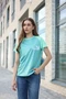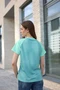 Модель. Приталенный силуэт. Рукав реглан. Футболка имеет боковые швы без разрезов по низу изделия. Обработка горловины (кантом) из основной ткани. Форма ворота  V-образная.