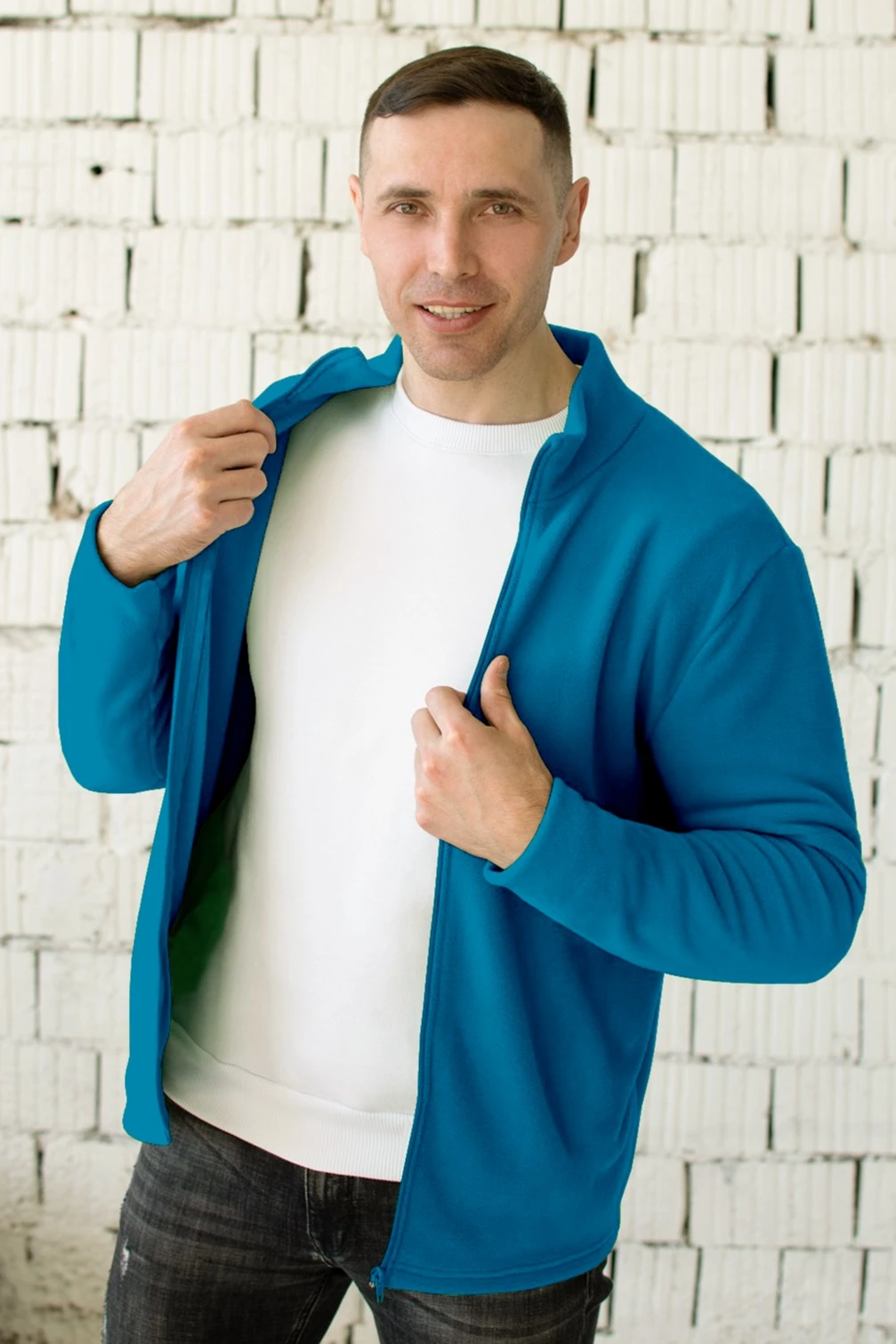 Модель. Толстовка Филл прямого силуэта с длинными прямыми рукавами. Застежка молния, воротник стойка. Толстовка без капюшона. Два кармана в боковом шве без молнии.