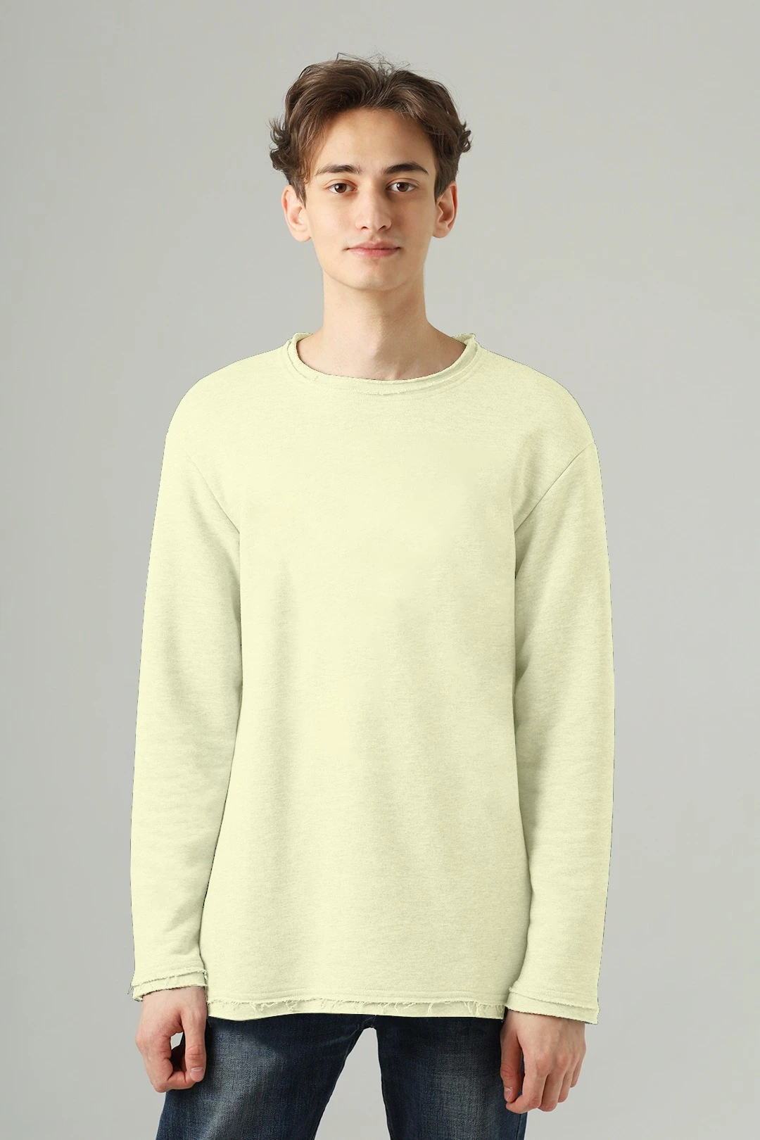 Модель. Толстовка прямого силуэта, без молнии с длинными рукавами и опущенной линией плеч. Низ толстовки и рукавов, а также горловина с имитацией необработанного края. Толстовка без капюшона и карманов.