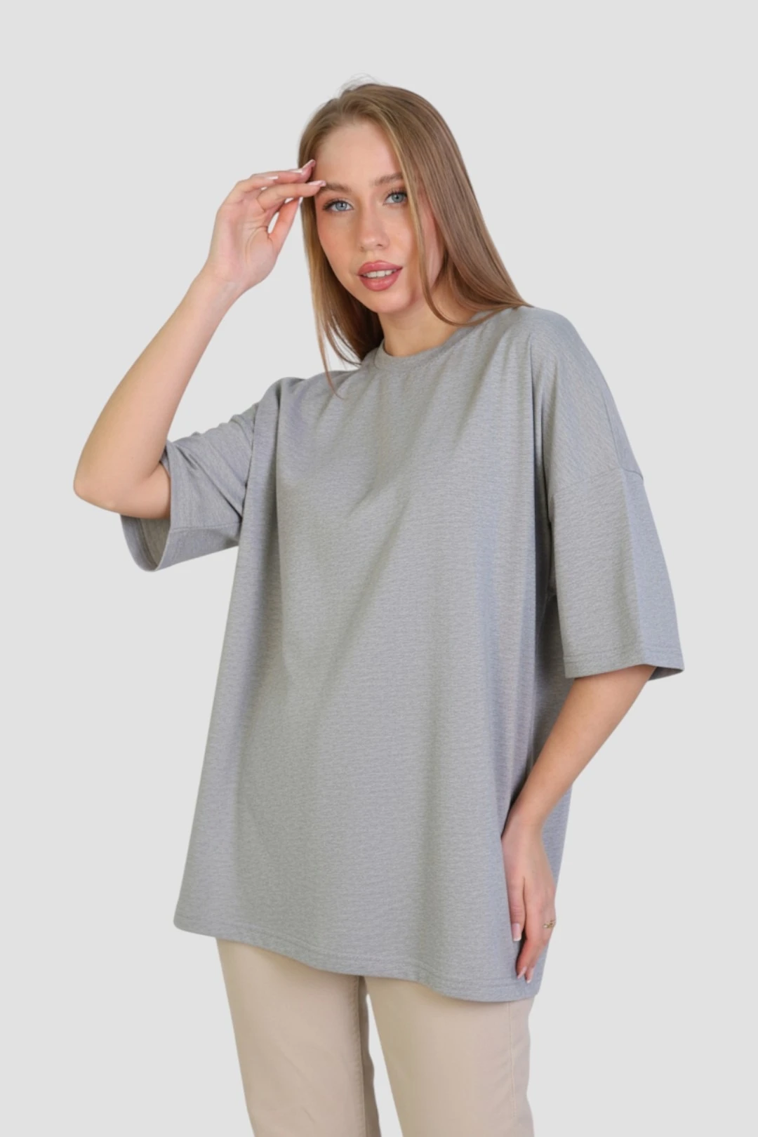 Модель. Футболка оверсайз. Обработка горловины - рибана из основной ткани. Низ изделия и рукава подгибаются внутрь. Форма ворота О-образная.