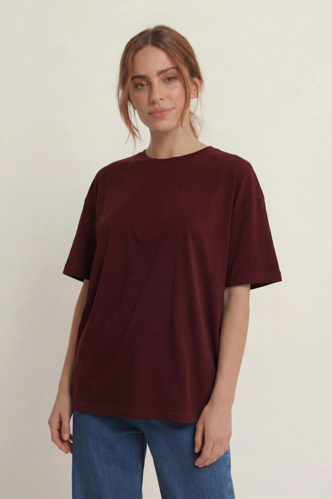 Модель. Прямой силуэт. Рукав короткий. Без боковых швов и разрезов по низу изделия. Обработка горловины эластичной рибаной (специальная тканая резинка) в цвет футболки. Форма ворота О-образная.