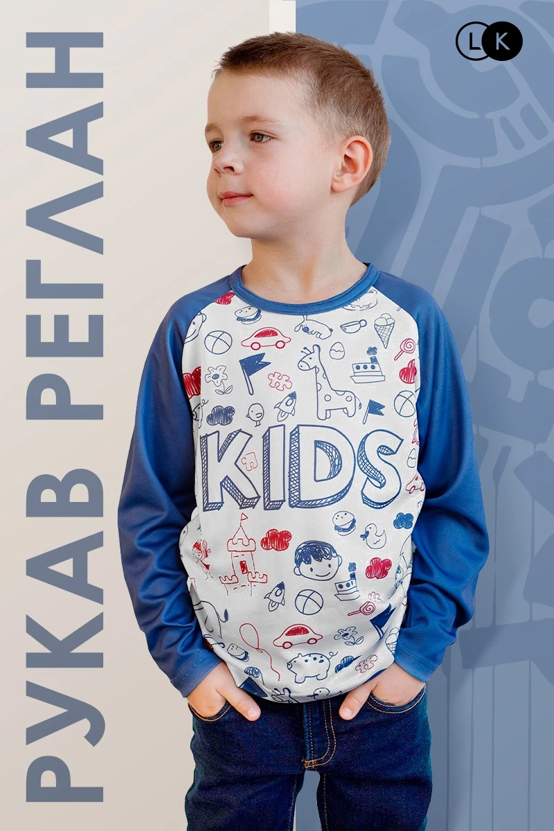 Модель. Прямой силуэт. Рукав длинный, реглан. Лонгслив имеет боковые швы без разрезов по низу изделия. Оформление горловины руликом (кантом) из основной ткани или рибаной. Форма ворота О-образная.