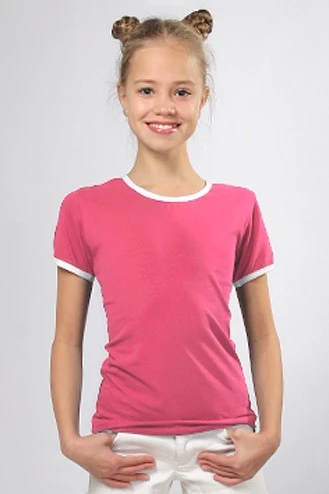 Модель. Прямой силуэт. Рукав короткий. К нижней части рукава пришивается декоративная вставка в цвет футболки или другого цвета. Футболка имеет боковые швы без разрезов по низу изделия. Обработка горловины руликом (кантом) из основной ткани в цвет футболки или другого цвета. Форма ворота О-образная. Возможно бесплатное комбинирование деталей разных цветов (например, рукава могут отличаться по цвету от остальных деталей).