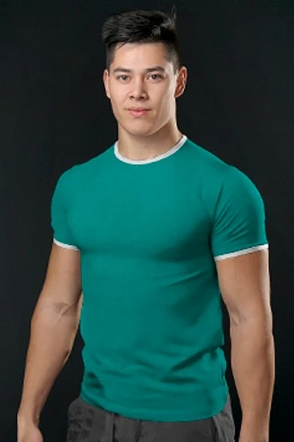 Модель. Прямой силуэт. Рукав короткий. К нижней части рукава пришивается декоративная вставка в цвет футболки или вставка стандартных цветов. Футболка имеет боковые швы без разрезов по низу изделия. Обработка горловины руликом (кантом) из основной ткани в цвет футболки или других стандартных цветов. Форма ворота О-образная.