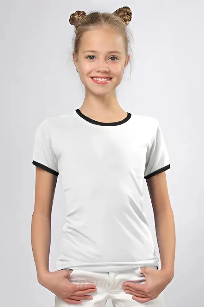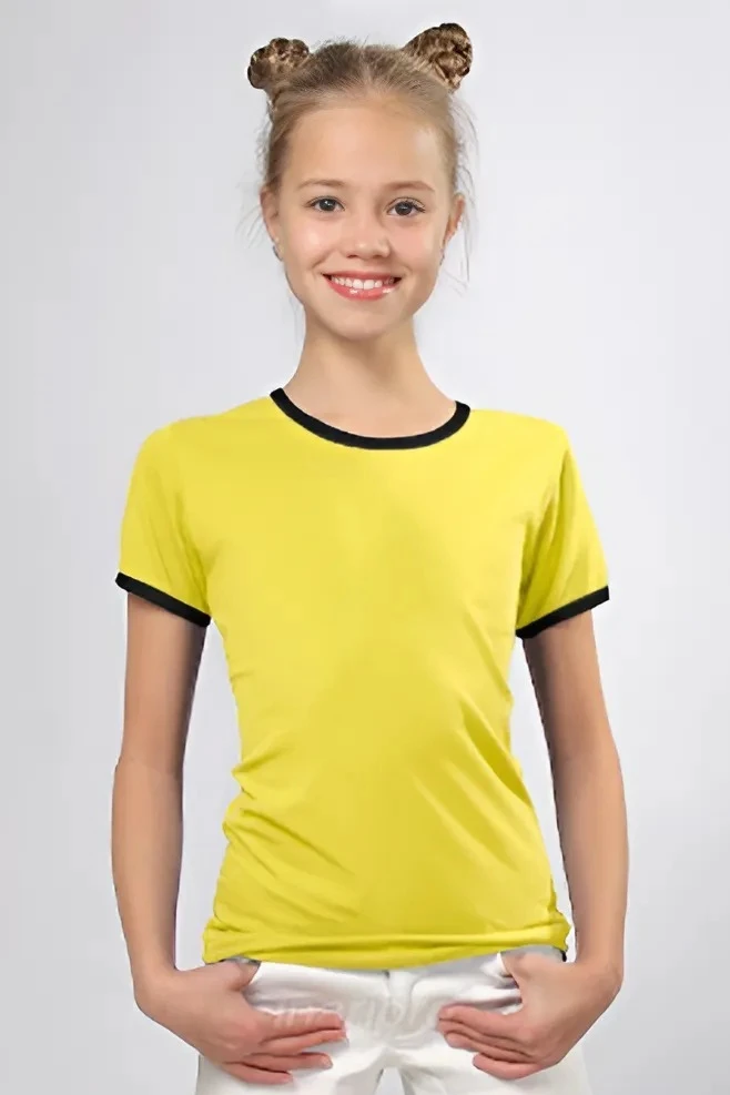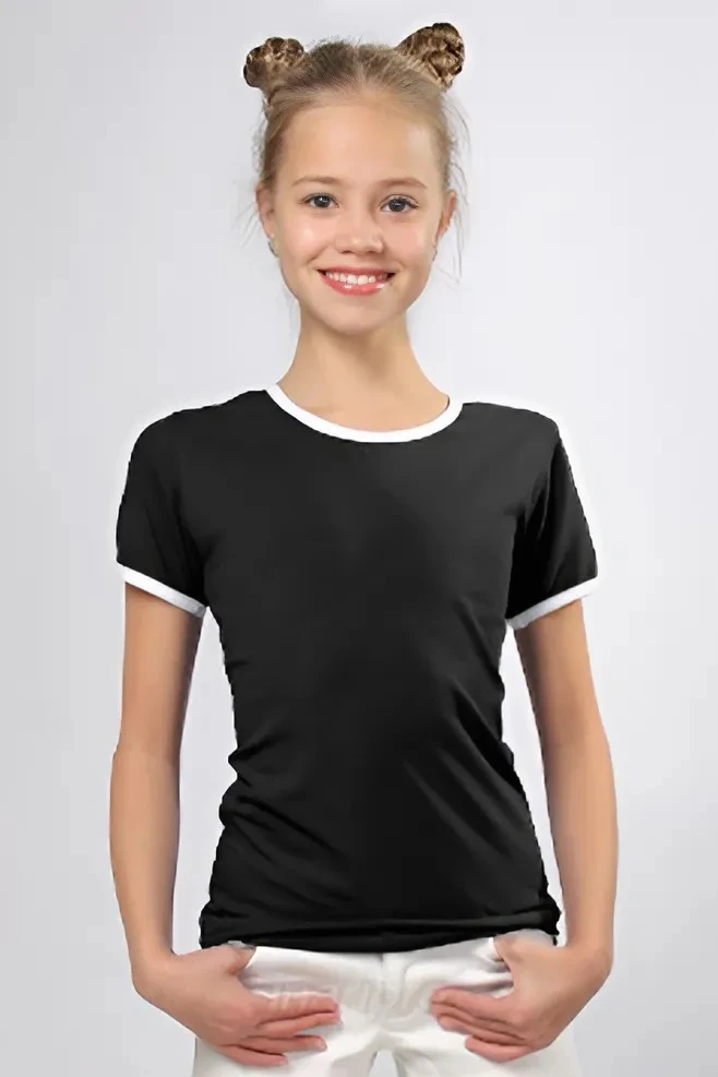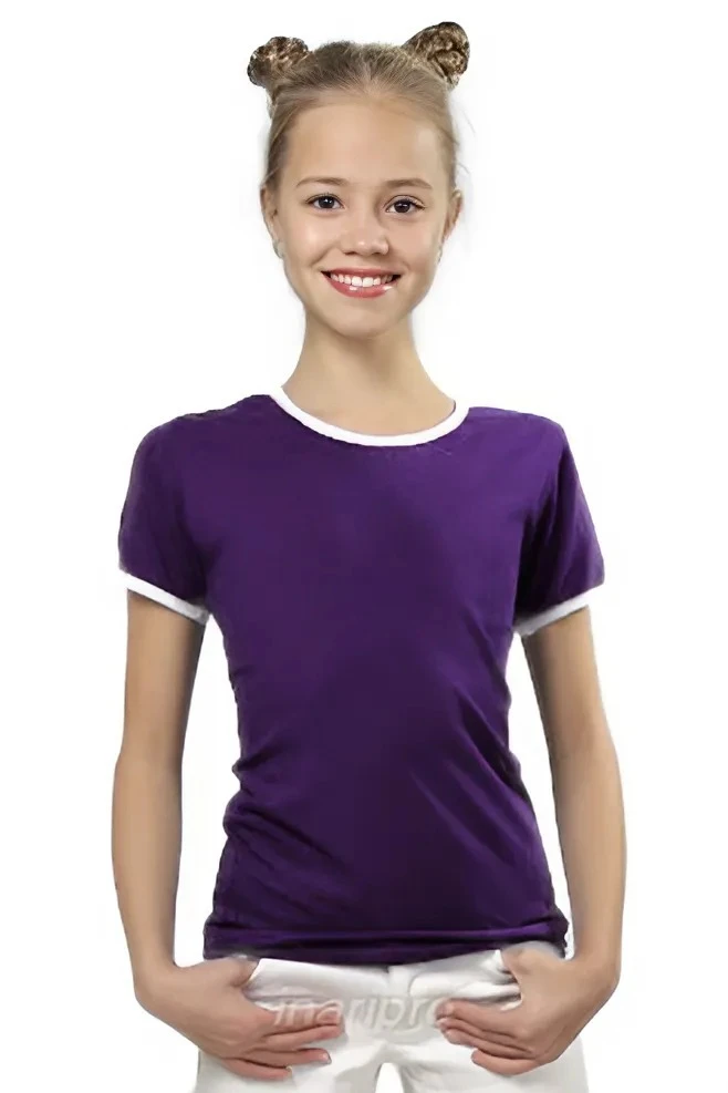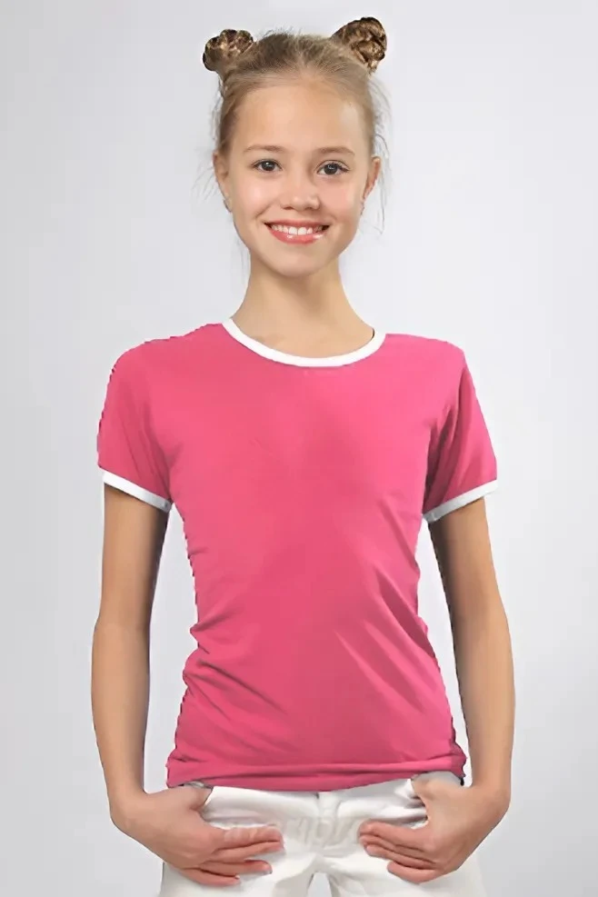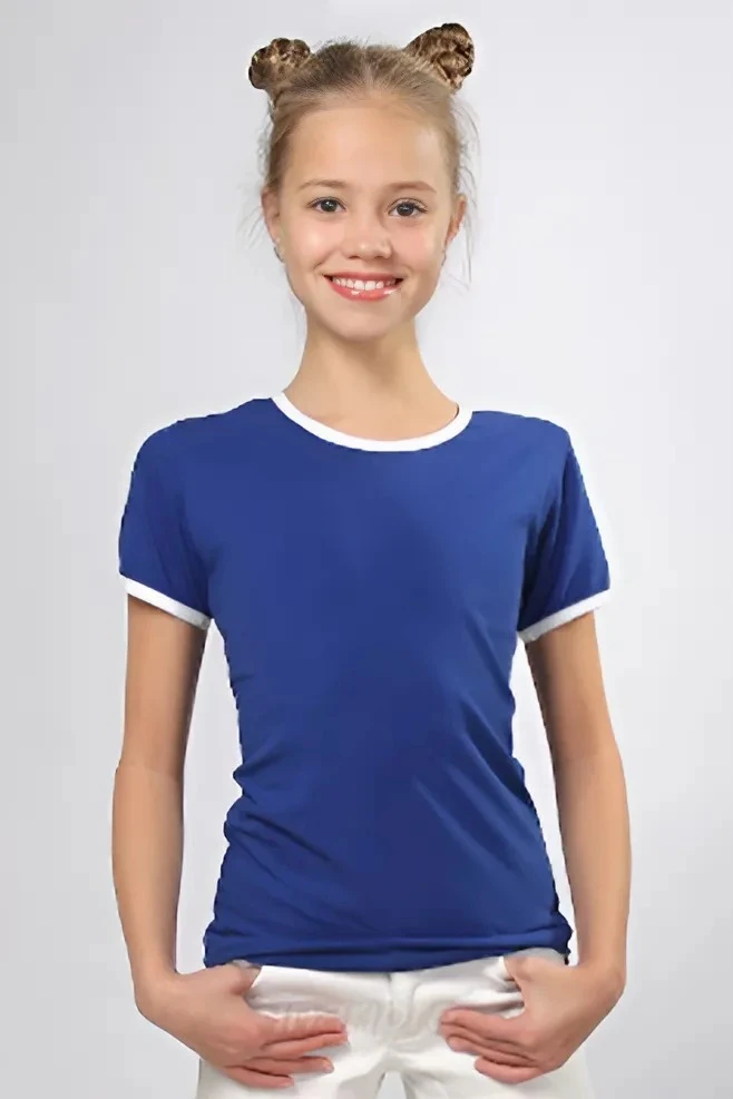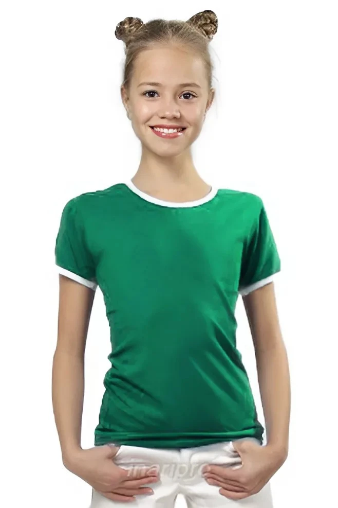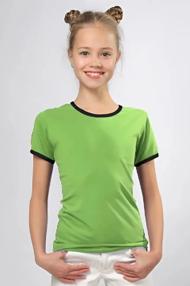 Модель. Прямой силуэт. Рукав короткий. К нижней части рукава пришивается декоративная вставка в цвет футболки или другого цвета. Футболка имеет боковые швы без разрезов по низу изделия. Обработка горловины руликом (кантом) из основной ткани в цвет футболки или другого цвета. Форма ворота О-образная. Возможно бесплатное комбинирование деталей разных цветов (например, рукава могут отличаться по цвету от остальных деталей).