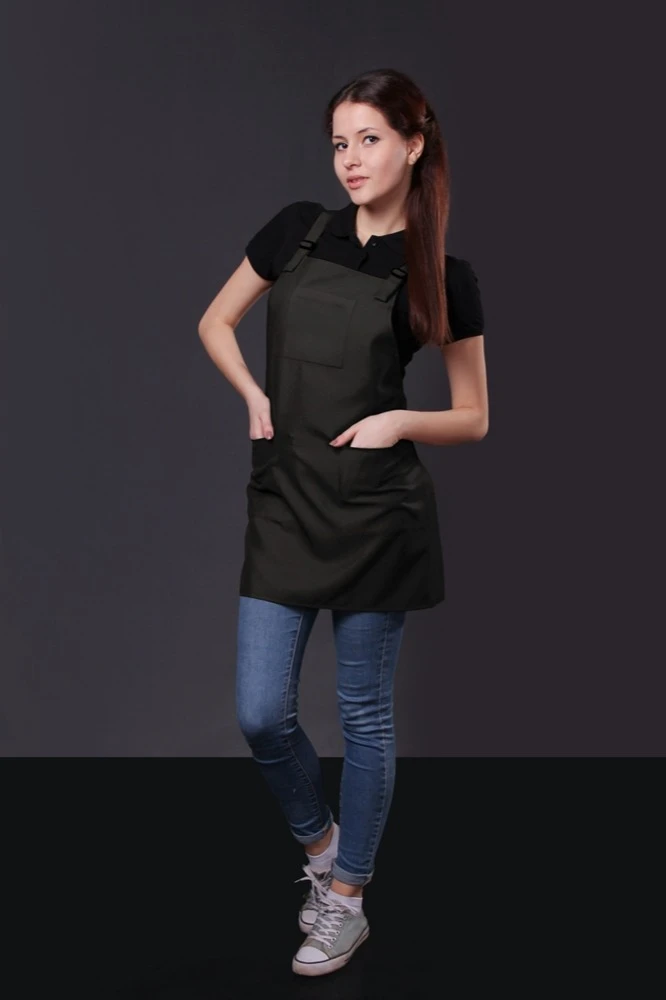 Модель: Фартук фигурной формы без разреза. Фартук по периметру обработан швом вподгибку. Фартук может быть изготовлен с одним карманом 18х70 см, разделенным на 6 отсеков, либо с тремя карманами: два боковых 18х20 см и один карман на груди 13х12 см. Креплением служат перекрещивающиеся на спине лямки. Лямки из основной ткани фиксируются на груди с помощью двух пластиковых регуляторов черного цвета. В районе пояса лямки продеваются через два никелированных люверса диаметром 15 мм.