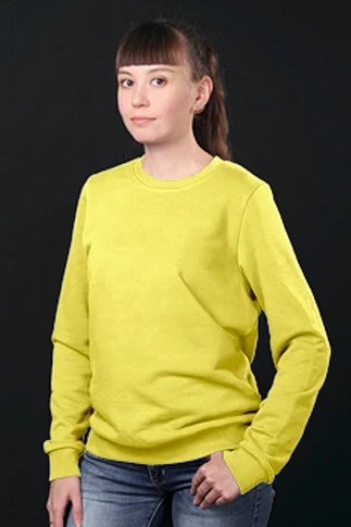 Модель. Прямой силуэт. Толстовка без молнии. Длинные рукава. Низ толстовки и рукавов, а также горловина обработаны тканью кашкорсе (специальная тканная резинка) в цвет толстовки. Толстовка без капюшона и карманов.
